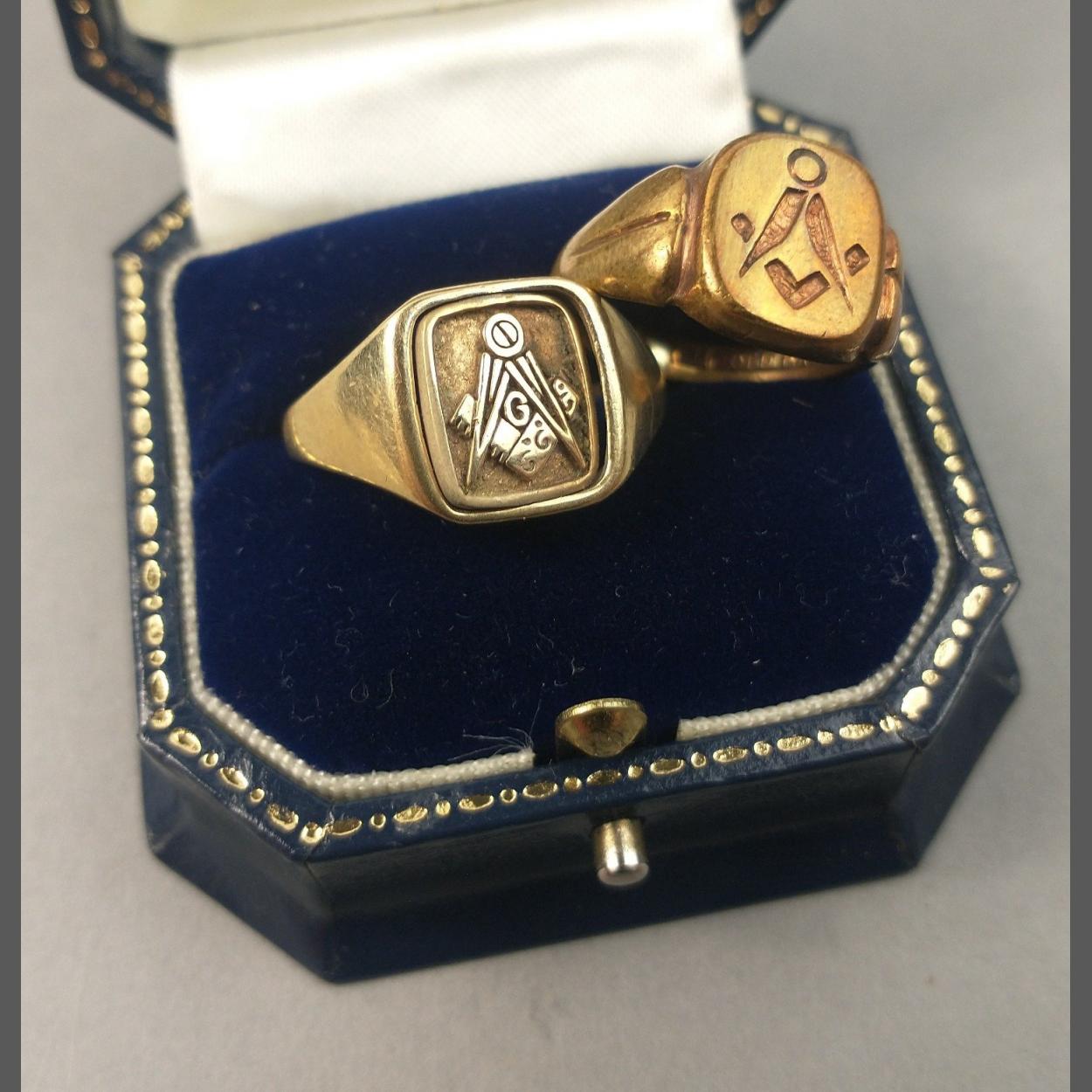 A MASONIC gold ring fully marked 375 with swivel hidden symbol, size S weight 4.9g approx. In good condition plus one other Masonic ring
