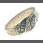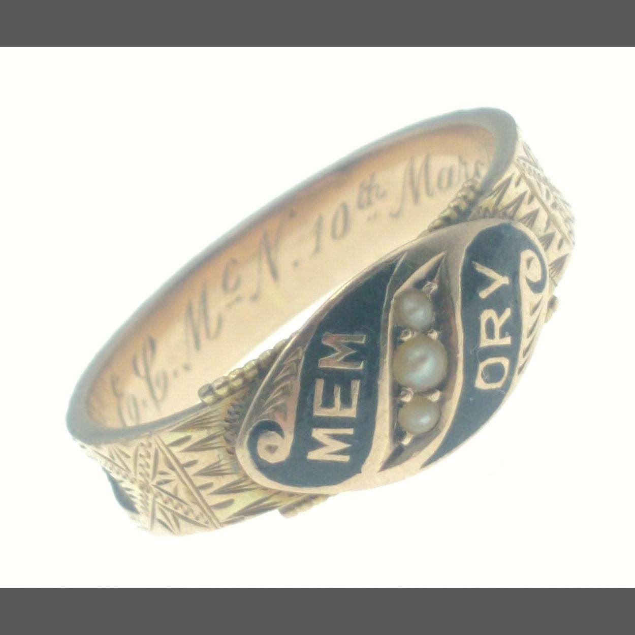 An early 20th century Chester hallmarked mourning ring, set with 3 very small seed pearls and inset hair ring, size S, gross weight 2.4g approx