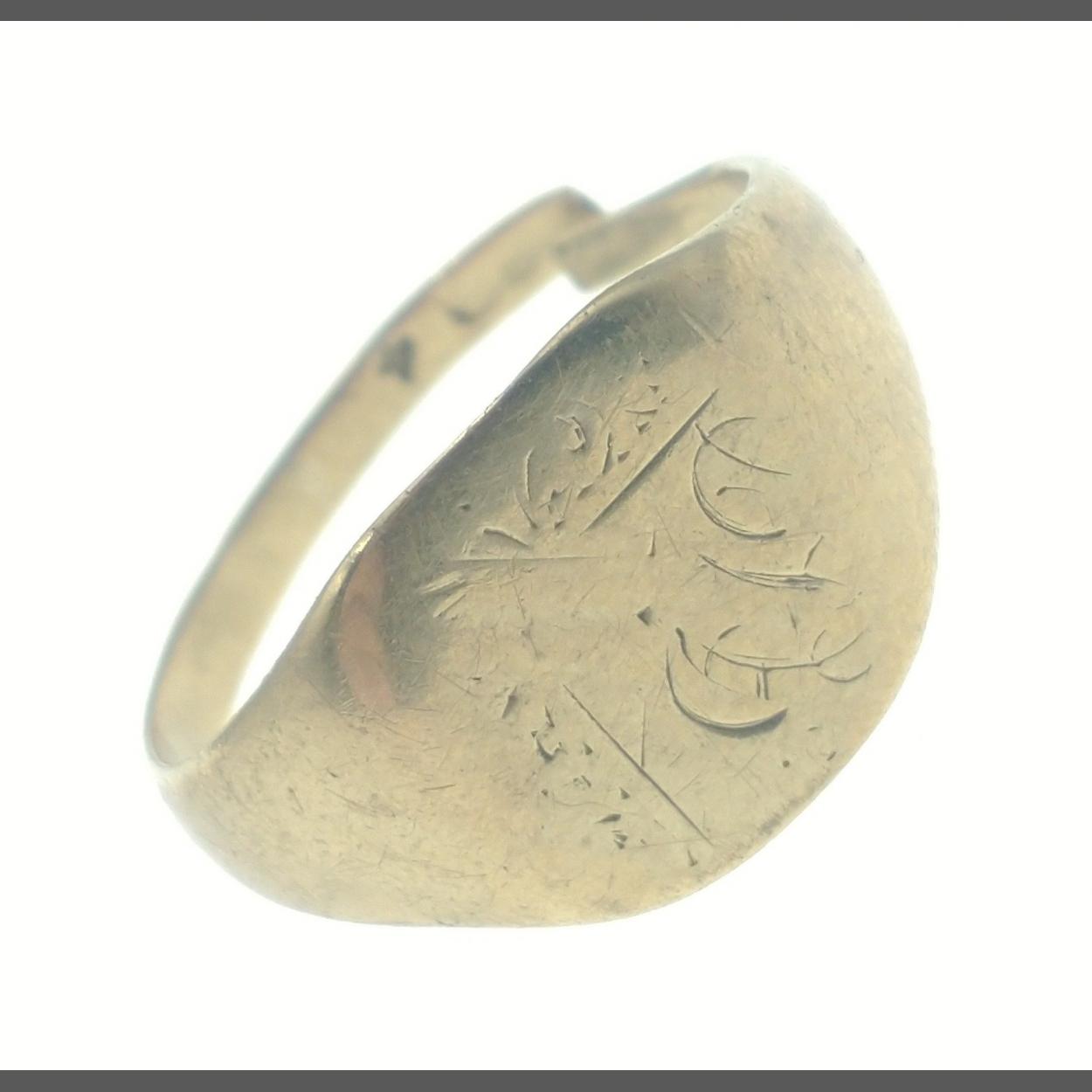 A well-worn gold signet ring with indistinct hallmarks, inscription dated 1950, weight 2.4g approx