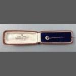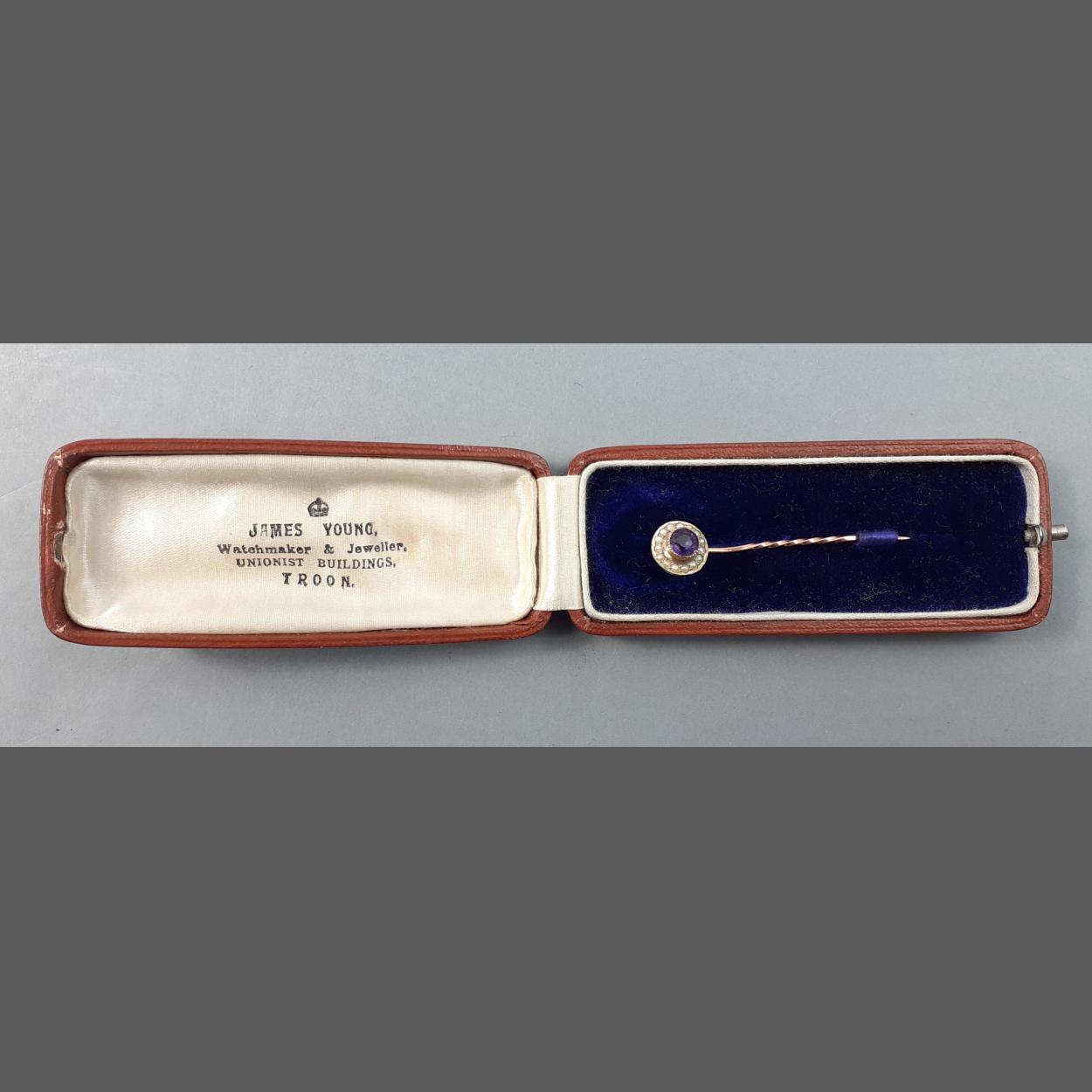 A beautiful cased 9ct gold stick pin, with amethyst centre stone surrounded by seed pearls, in lovely condition presented in a Troon jeweller's box, 2cm long approx