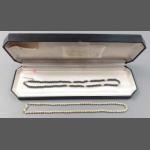 A box containing 2 sets of quality pearls, the black strand with faint 9k mark to clasp, the other set with full 375 hallmarks (both 40cm long approx)