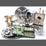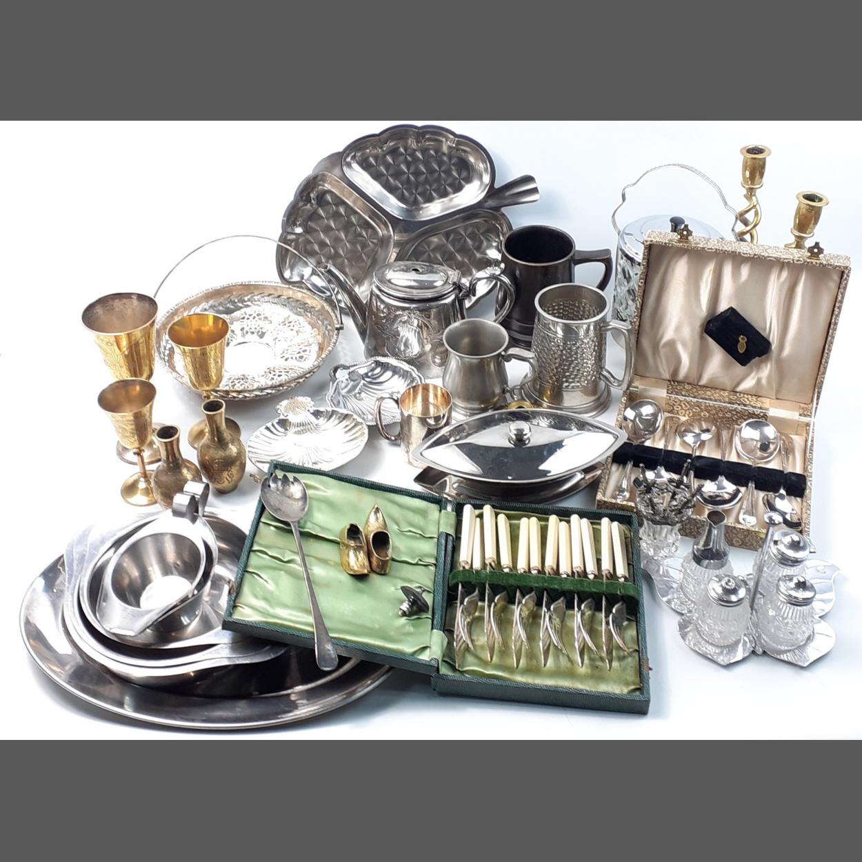 An assorted box of metalware to include trays, biscuit barrel, tankards, brass candlesticks, brass goblets and 2 cased sets of flatware
