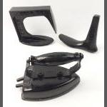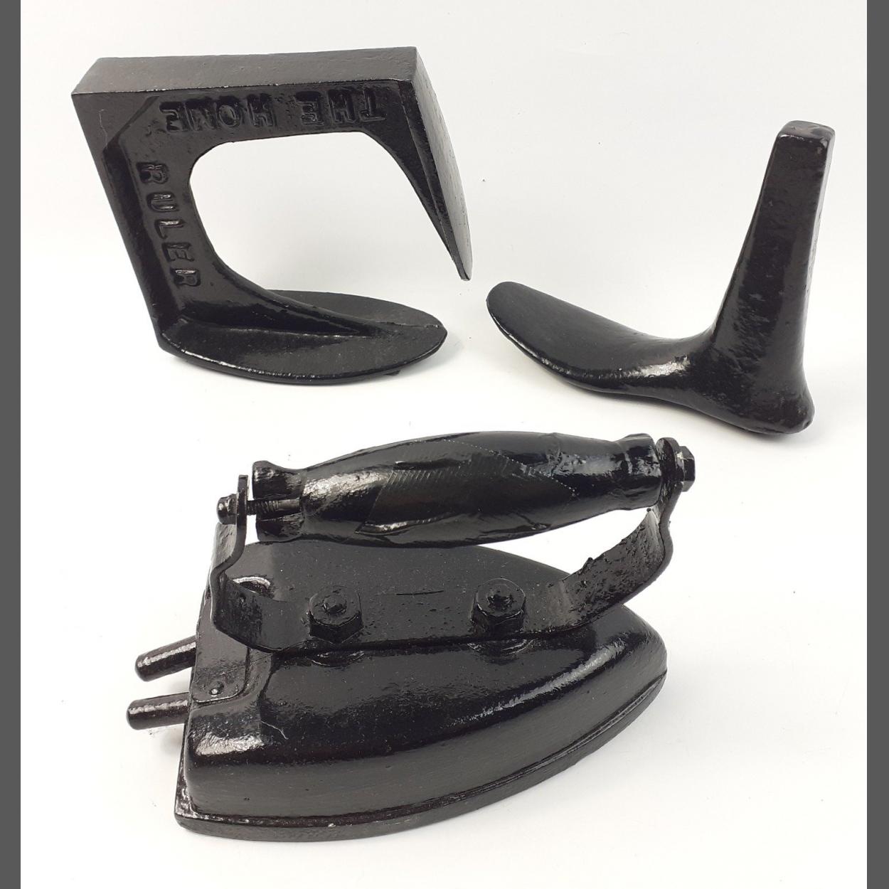 Black painted heavyweight doorstoppers to include a flat iron and 2 cobbler's lasts.