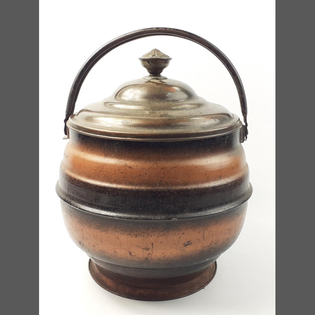 A large lidded metalware pot with handle. Stands 40cm to handle