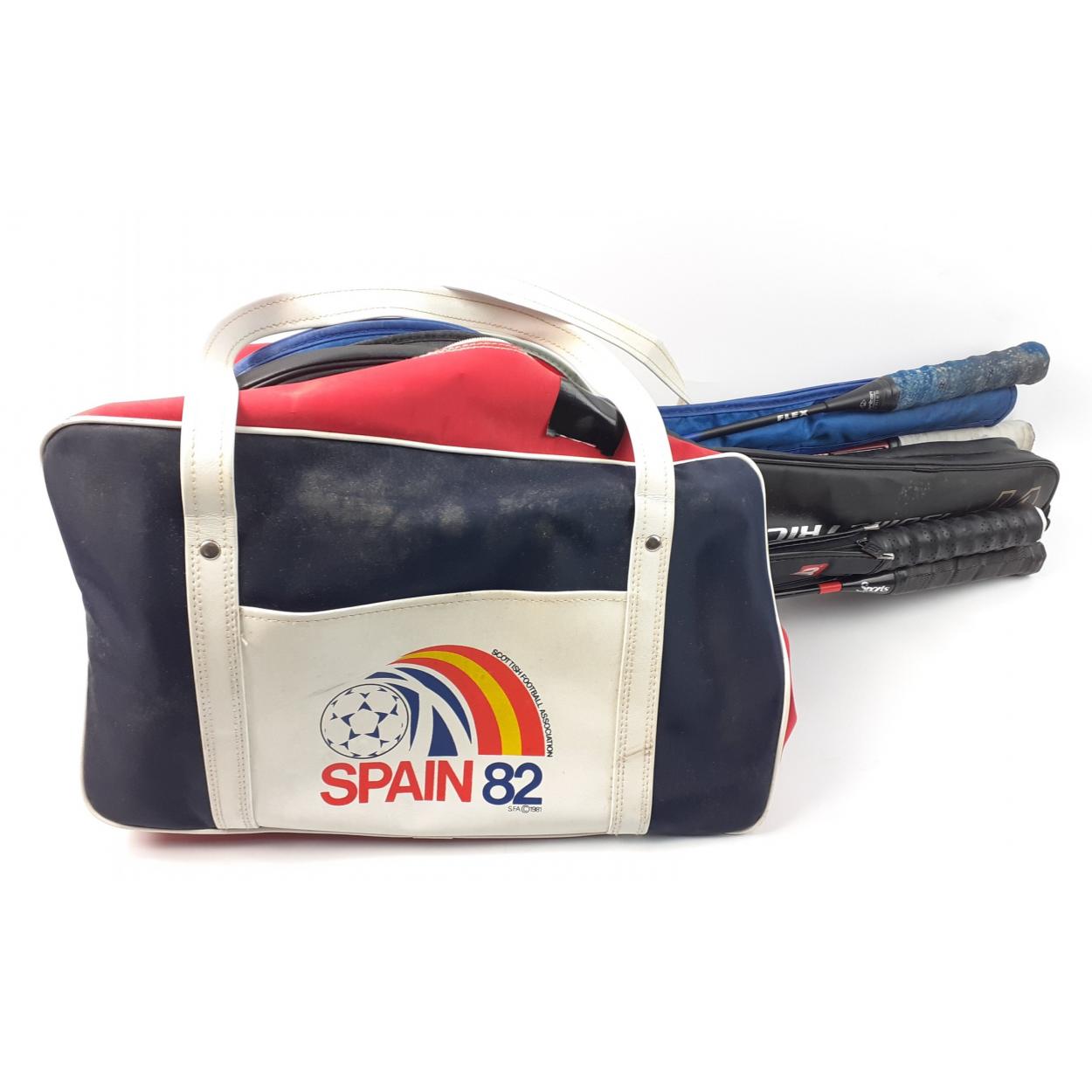 A collection of sports racquets to include OLYMPUS B15 SPORT badminton racquet, a SIERRA GTi 30 badminton racquet, a CARLTON Flex racquet, a WILSON Force racquet plus others by YONNEX, shuttlecocks and a Scottish Football Association Spain 82 sports bag