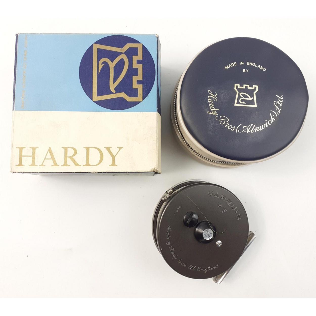 A HARDY of ALNWICK Marquis no 7 fly reel in soft case and original box. Appears in good condition with strong ratchet