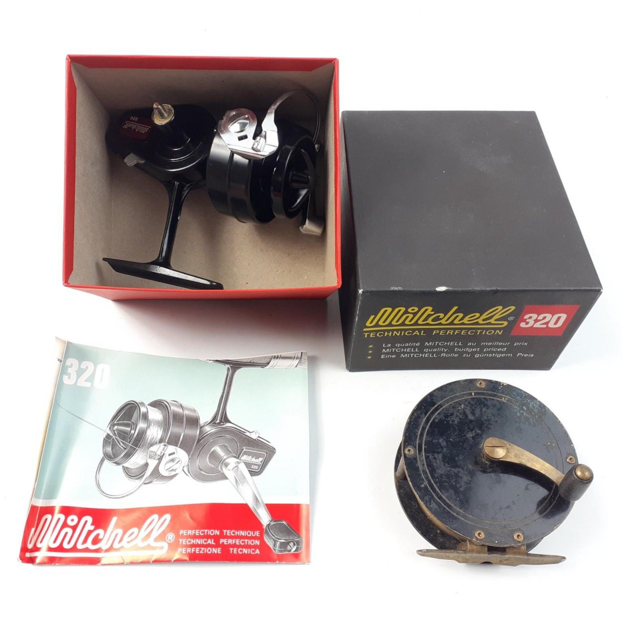 A MITCHELL 320 spinning reel in a box in good order comes with one other unbranded vintage brass fly reel