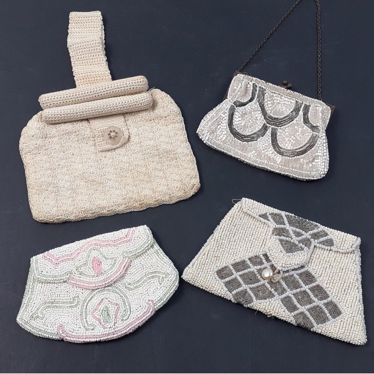 Three beautiful vintage evening beadwork bags, plus one crocheted. Largest 13cm across approx. A gorgeous, classy lot.