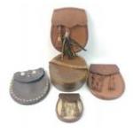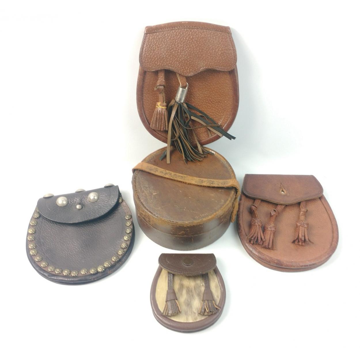 A VINTAGE leather collar box, top quality thick leather, diameter 18cm approx, with also 4 leather SPORRANS, one being a small child's sporran