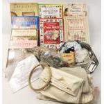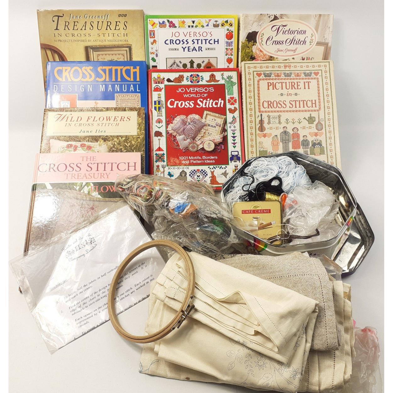 A stitcher's lot to include books by Jo Verso, Jane Greenhoff etc, mixed embroidery threads, linen tablecloths with pre-stamped patterns, small embroidery hoop etc