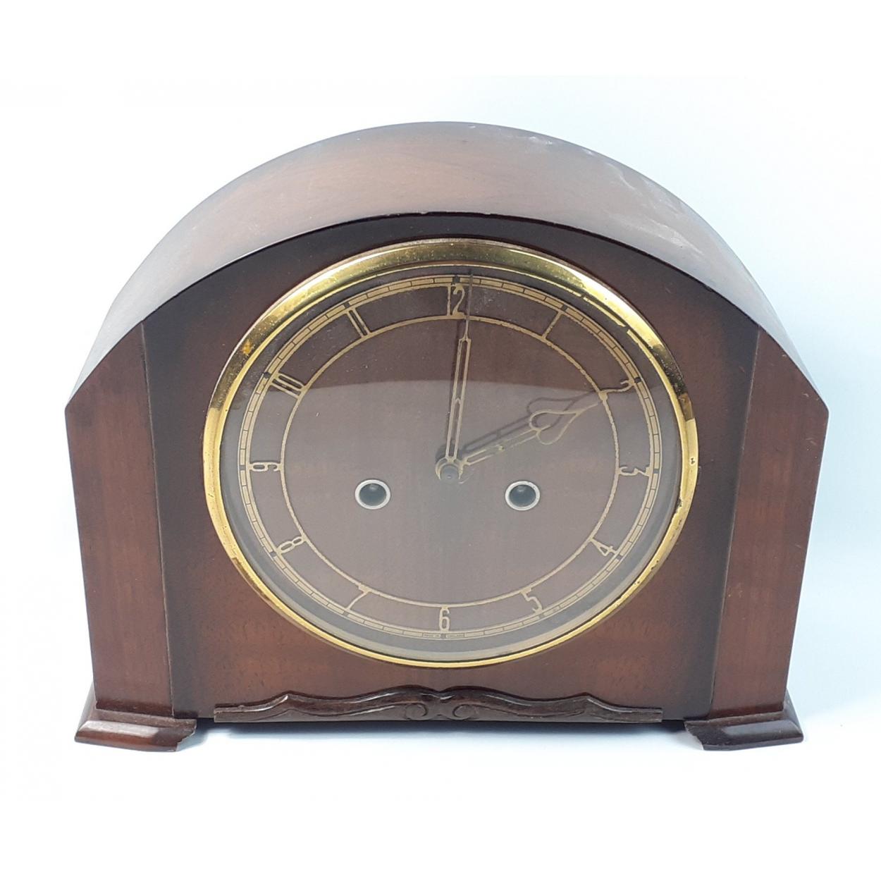 A Smiths Enfield wooden mantle clock with key. 29cm wide - 23cm tall approximately. A nice example.