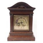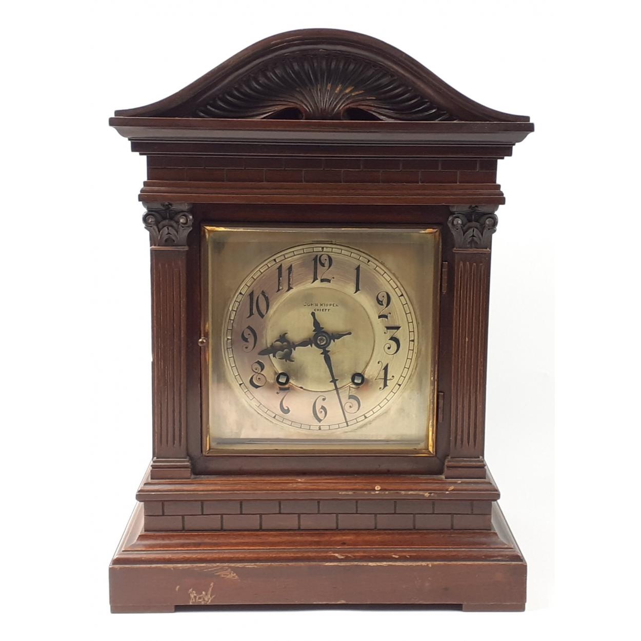A wooden mantel clock, movement by John Kippen of Crieff with steel dial. No key for the back, measures 41cm high