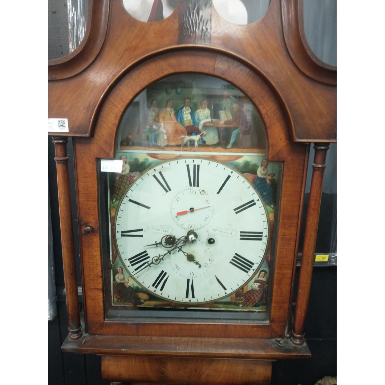A large and imposing superb Victorian grandfather clock standing 220cm tall approx, with elaborate painted face by JOHN KEDDIE, Markinch, face 30cm dia approx, with pendulum and weights