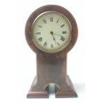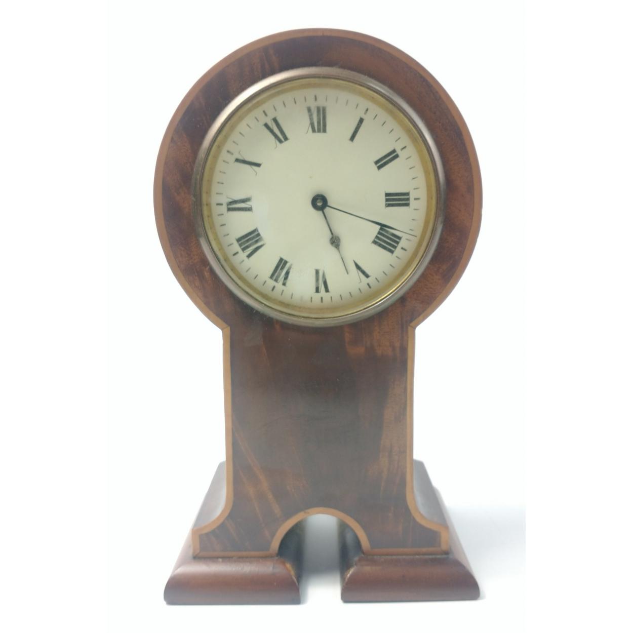 A pretty little mantle clock in nice wooden curved finish with inlaid edges. No maker but recumbent Lion stamp on brass movement. 23cm high. Supplied with key but not currently running.