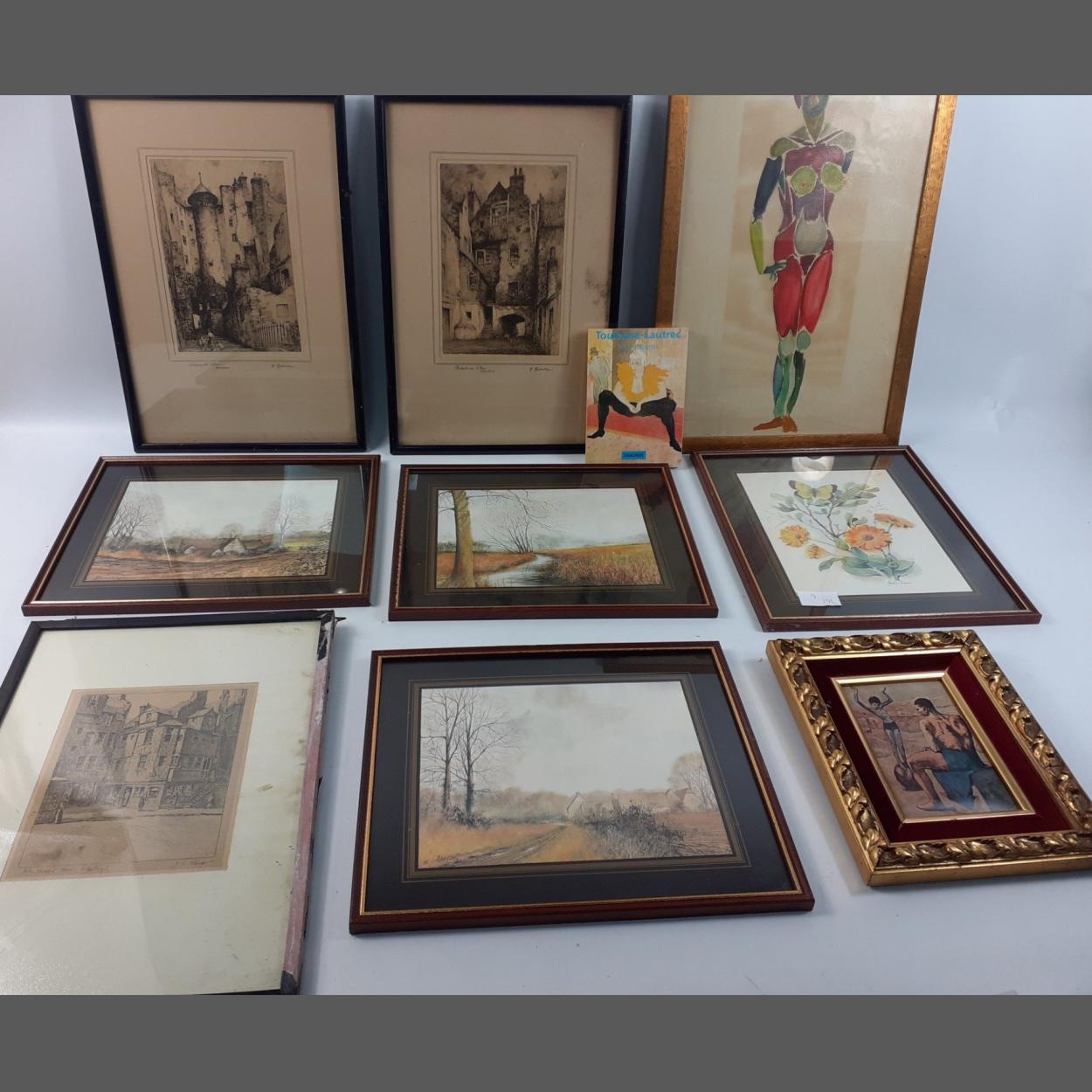 A box of small framed PRINTS and an abstract WATERCOLOUR painting to include 3 scenes of Edinburgh 3 landscapes a floral print a small Picasso print and a book of Postcards by Toulouse-Lautrec