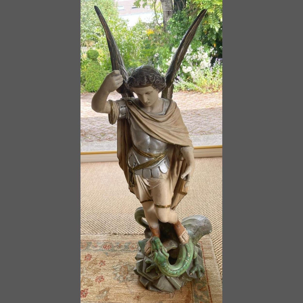 ANTIQUE plaster of Paris St GEORGE SLAYING THE DRAGON statue inspired possibly French - 1m tall - this statue has various historical cracks and it's been repaired each time - but still looks FANTASTIC!