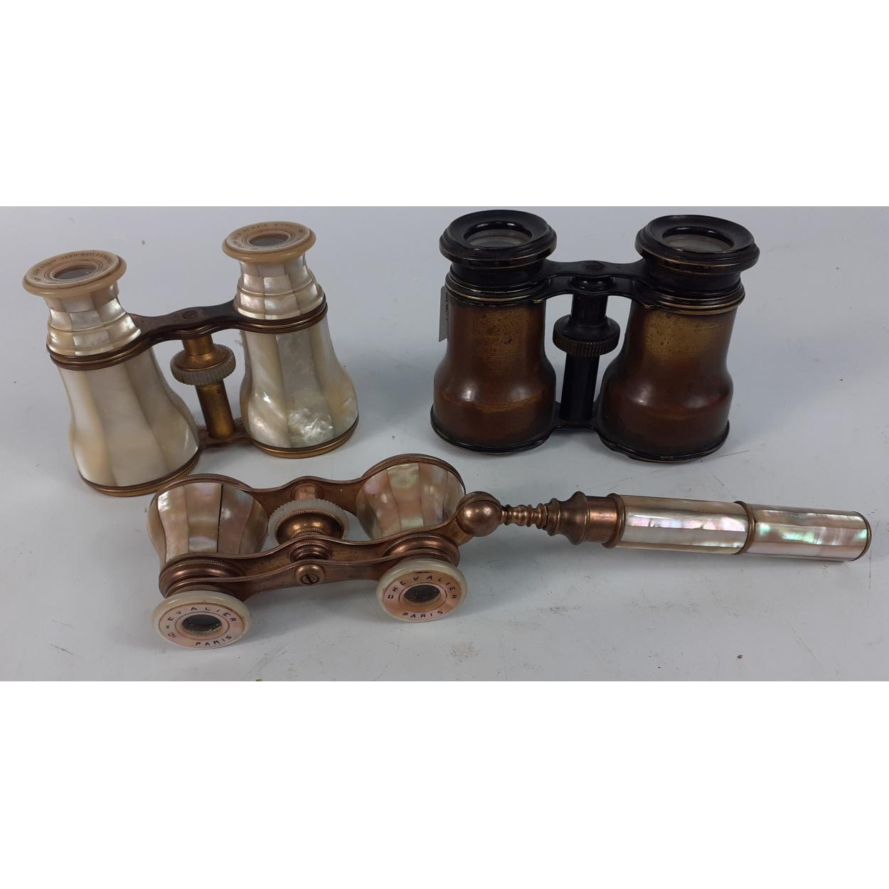 An interesting collection of opera glasses to include CHEVALIER PARIS brass and mother of pearl finish. mechanism is a little stiff but optically good and body in good order. A further pair of Portuguese opera glasses by EDUARDO AUGUSTO PEREIRA Oculista of Lisbon in brass and Mother of Pearl. There is MOP loss to one lens side, otherwise nice item with good optics. A further pair of unbranded brass glasses.