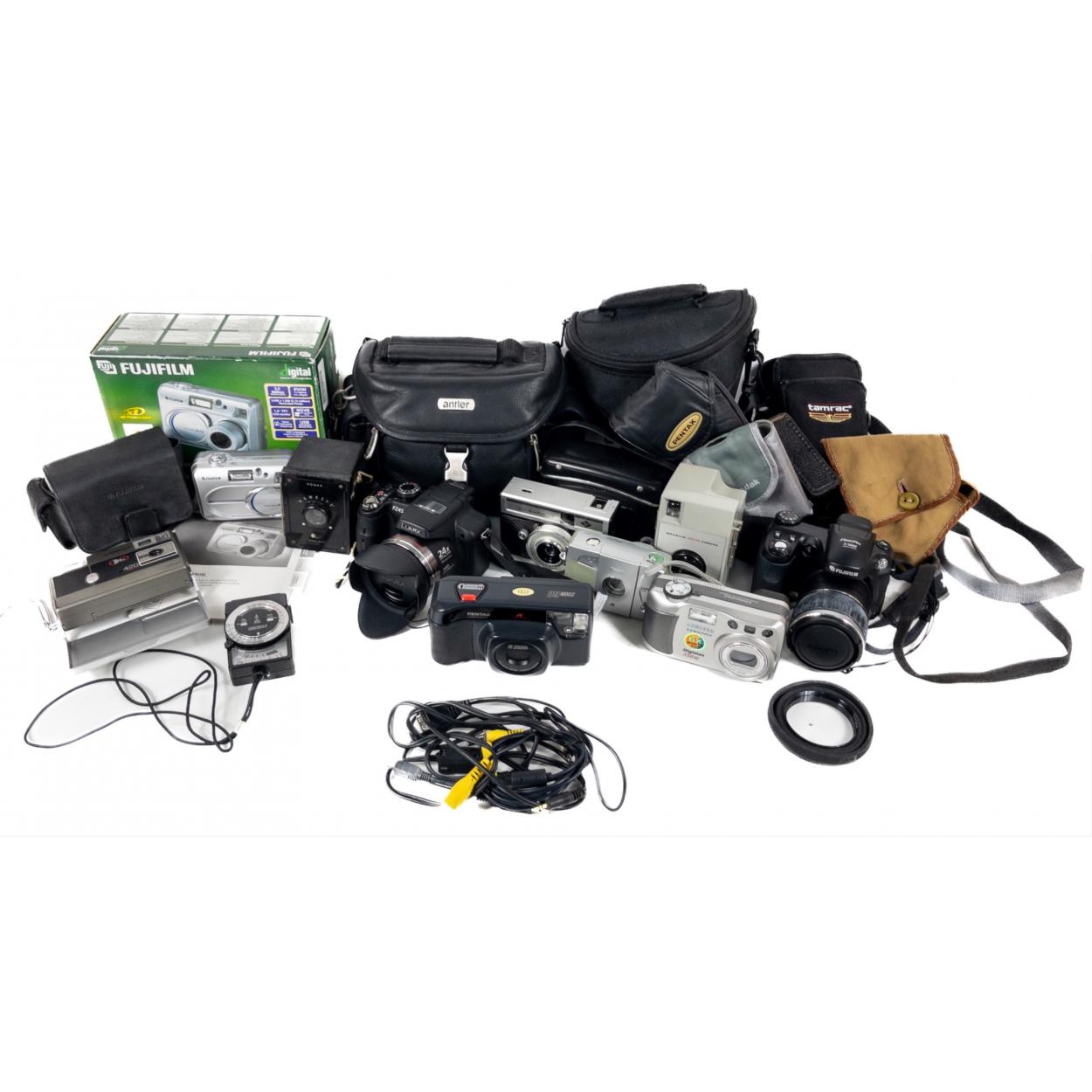 A collection of cameras to include an Agfa ISO RAPID I with case, a BROWNIE Vecta camera, a weatherproof KODAK Advantix T700 in case, a HAWKEYE box camera, a SAMSUNG Digimax 350SE camera with case, a FUJIFILM FinePix A210 digital camera in original box, a FUJIFILM FinePix S5600 in a padded case, and a PENTAX AF Zoom 60 camera with case, a LUMIX FZ45 camera in Antler camera case, a HANIMEX 420 Sensor camera and a light meter in case