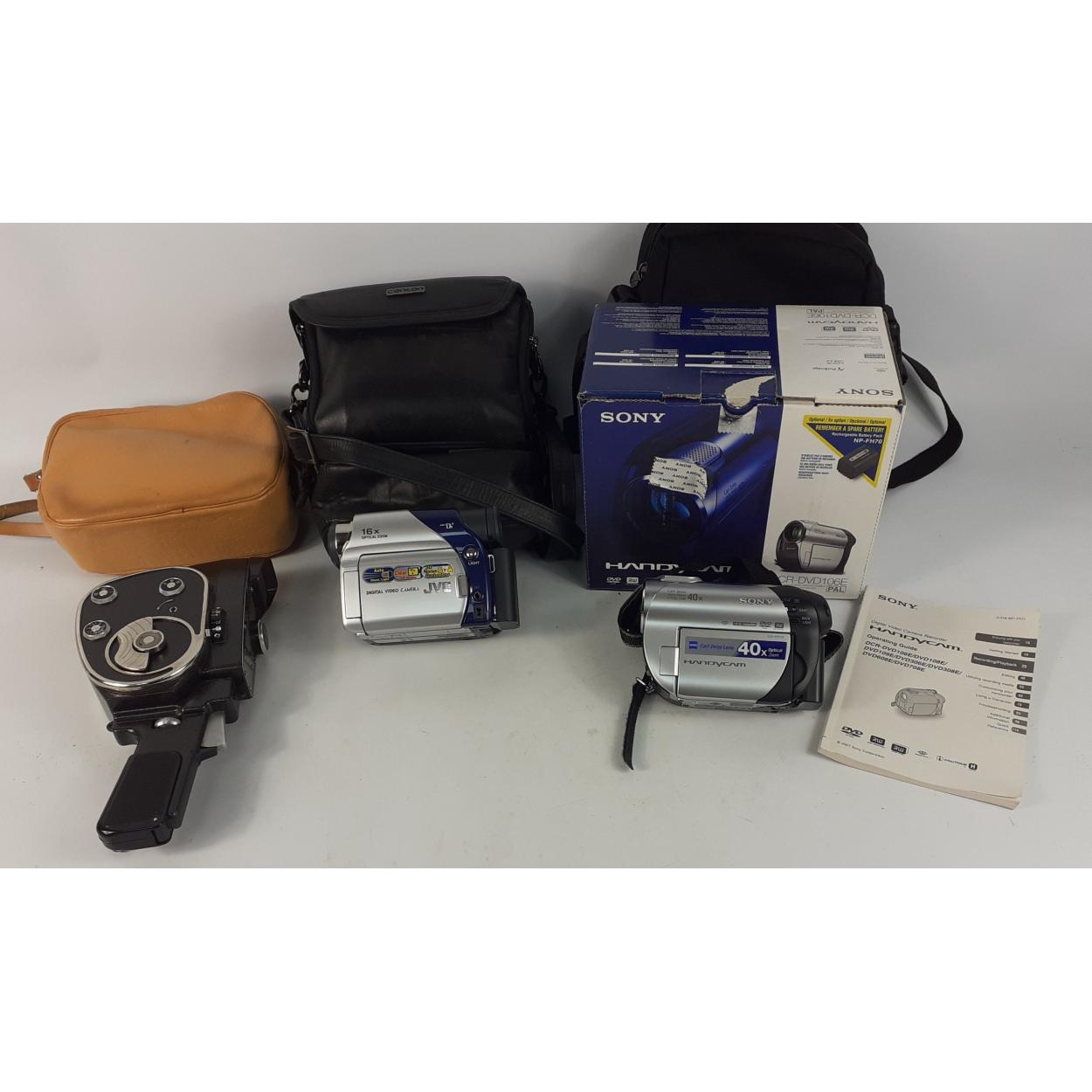 A Russian QUARZ cine camera with supporting handle and instruction manual in a leather case plus two digital video cameras to include a JVC GR-D53EK in case (no charger), and a SONY 106E with case, charger and original box