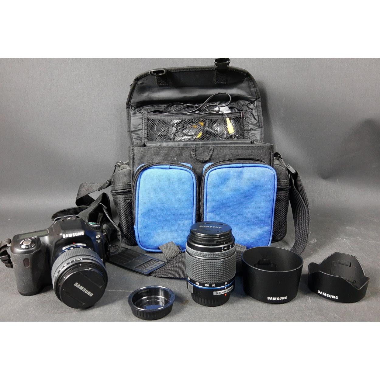 A SAMSUNG GX-1L digital SLR camera with a Schneider-Kreuznach D-Xenon 1:4.0-5.6 50-200mm ED 52mm lens, and a Schneider-Kreuznach D-Xenon 1:3.5-5.6 18-55 mm AL52mm lens all within a Kodak Gear camera bag