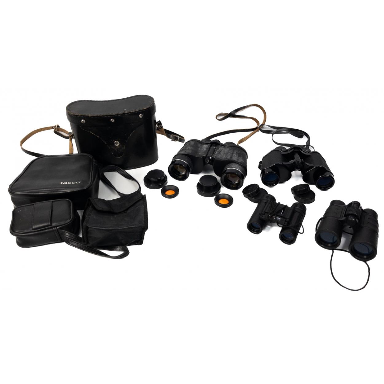 A pair of TENTO 7x35 USSR binoculars with filters in case plus a cased pair of PRAKTICA Sport CN8x21 compact binoculars, a pair of TASCO 8x30 308 binoculars with case and lens caps, and an unlabelled pair of 4x30mm 302@ 1000yds binoculars in case