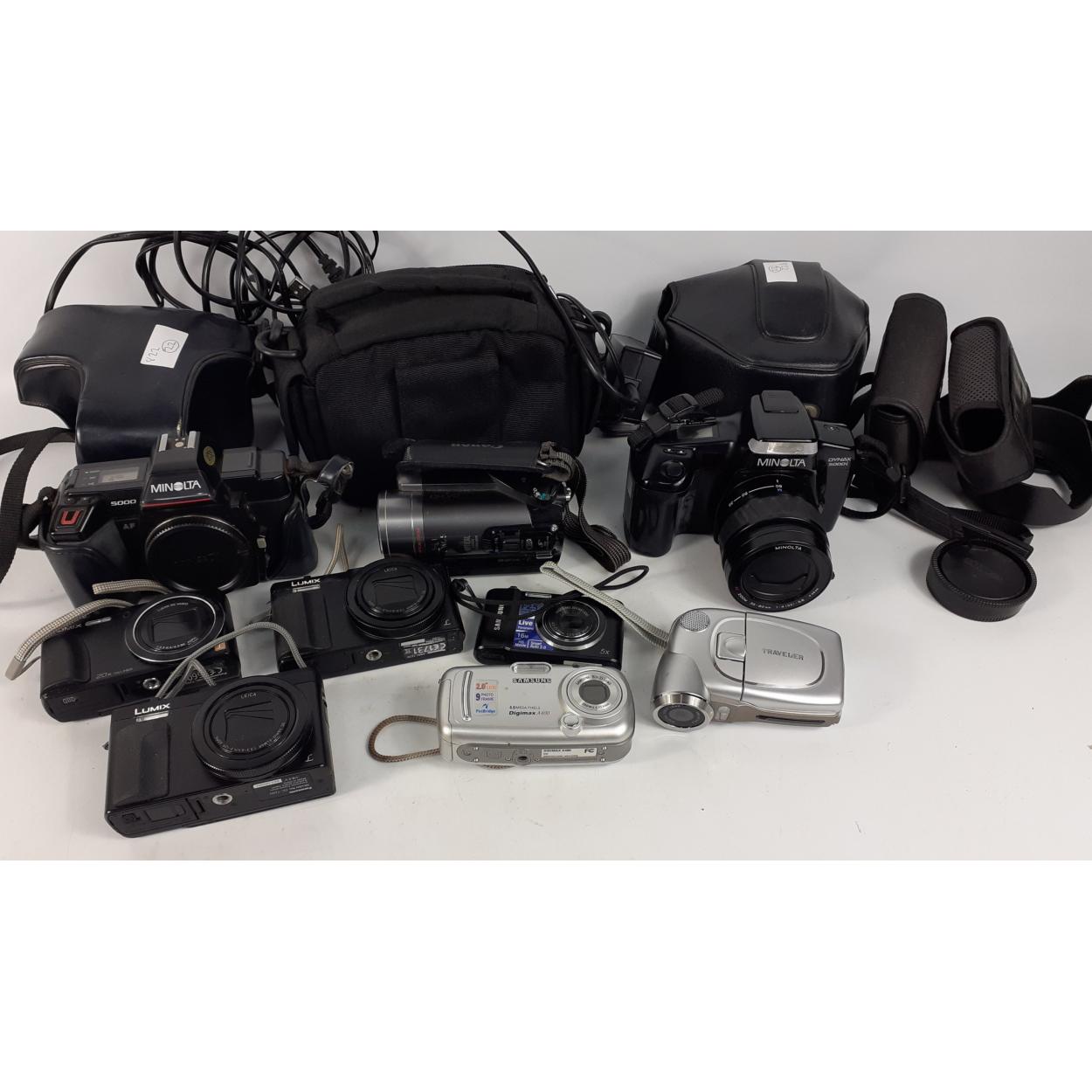 A box full of ASSORTED untested DIGITAL and FILM cameras to include Lumax , Minolta and Canon