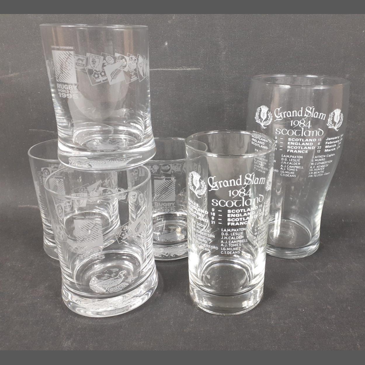 SCOTLAND RUGBY 1984 Grand Slam and 1995 World Cup glasses , a Pint and Hi-ball glass from the 84' Grand Slam and a set of 4 FAMOUS GROUSE tumblers from the 95' World Cup