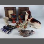 QUALITY LOT!! A mixed lot to include a large KINGSTON POTTERY Basset Hound 33cm approx with repair to front paw, a Brazilian ceramic duck plus one other, two art pottery style ceramic goblets, a small 'Jorvik' souvenir goblet, two 4"x6" wooden picture frames and four plated souvenir spoons with a Lifeboat RNLI theme.