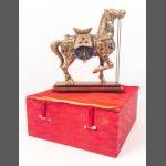 An ORIENTAL gilt metal horse with wirework detail and enamelled decoration , the horse stands on a wooden base and comes in a red material covered box , stands 24cm