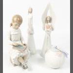 A small collection of Lladro figures in excellent condition to include, small girl sitting on stool writing on slate, 1995 Bauble, Angel figure and a Bride which are both bells. Angel figure is 23cm tall and all are in good undamaged condition.