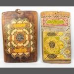 Two very attractive ARABIC PRAYER BOARDS. Largest 53 x 37cm approx with beautuful gilt lettering and decoration. THe smaller one is 53 x 31cm and is more heavily embossed. Very ususual attractive pieces.