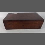 An antique writing slope in need of some restoring there is some loss to the veneer and the lock while having a key will not close properly the box measures 43cm long 25cm wide and 13cm deep
