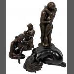 Heredities Cold Cast Bronze statuette figure pair of naked man and woman embracing signed Roland Chadwick 1986, 33cm approx. Includes Heredities figure of Mother with Baby entitled FIRST LOVE 19cm high approx, LEONARDO crouching nude 22cm across approx and one other