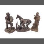 Three bronzed resin figure groups to include a very attractively sculpted Blacksmith with horse 21cm high approx, a Shepherd with collie feeding a lamb and a Gardener and small Terrier with large marrow both approx 24cm tall, the latter from the Heredities collection signed by J Bromley.