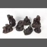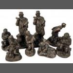 A collection of eight farming themed bronzed resin statues from HEREDITIES and others. Largest is 23cm high approx. To include two Shepherds standing feeding lambs, two shepherds sitting with collies feeding lambs, Gunman with Retriever and others