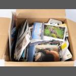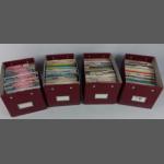 Four boxes of modern postcards, sorted into categories with dividers in maroon storage boxes.