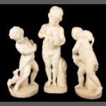 A trio of nineteenth century ITALIAN alabaster figures depicting children with animals (Putti), incorporating one child with dog and puppy, one with cat and birds nest and largest with a bird. Generally excellent condition. May have slight damage to birds wing tip and tail. Largest figure is 38cm tall approx.