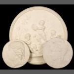 A trio of plaster wall plaques, likely Italian. The largest approx 37cm across depicting trio of cherub type figures.