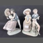 Two LLADRO groupings each of 2 children - one a boy trying to snatch a kiss from a girl and the other a boy playing the lute for a wee girl, no chips, cracks or visible damage