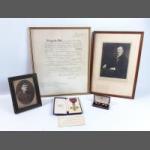A boxed MBE with presentation certificate signed by TWO KINGS George V and his son the future Edward VIII in his capacity as Grand Master and Knight Grand Cross of the British Empire, very unusual indeed to find two kings signatures on one document. The recipient William Robert Rae was apparently security Superintendent and a confidant of King George V and along with the MBE was presented with a private gift of the gold and seed pearl cufflinks obtained from the best Scottish retailer Hamilton & Inches, jewellers by appointment to his Majesty as well as his Grandmother Queen Victoria. There are also two personal photographs, one showing him proudly wearing the actual medal. The MBE is in the box as issued and the cufflinks are stamped WJH and 10ct. The gross weight of the cufflink pair is 6.1g but is outweighed by the story and history.