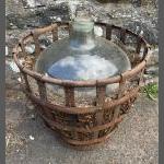 LARGE FRENCH ANTIQUE Demi-john carboy lidded bottle wine bottle cushioned with straw in its original iron basket height 60cm x diameter 50cm approx