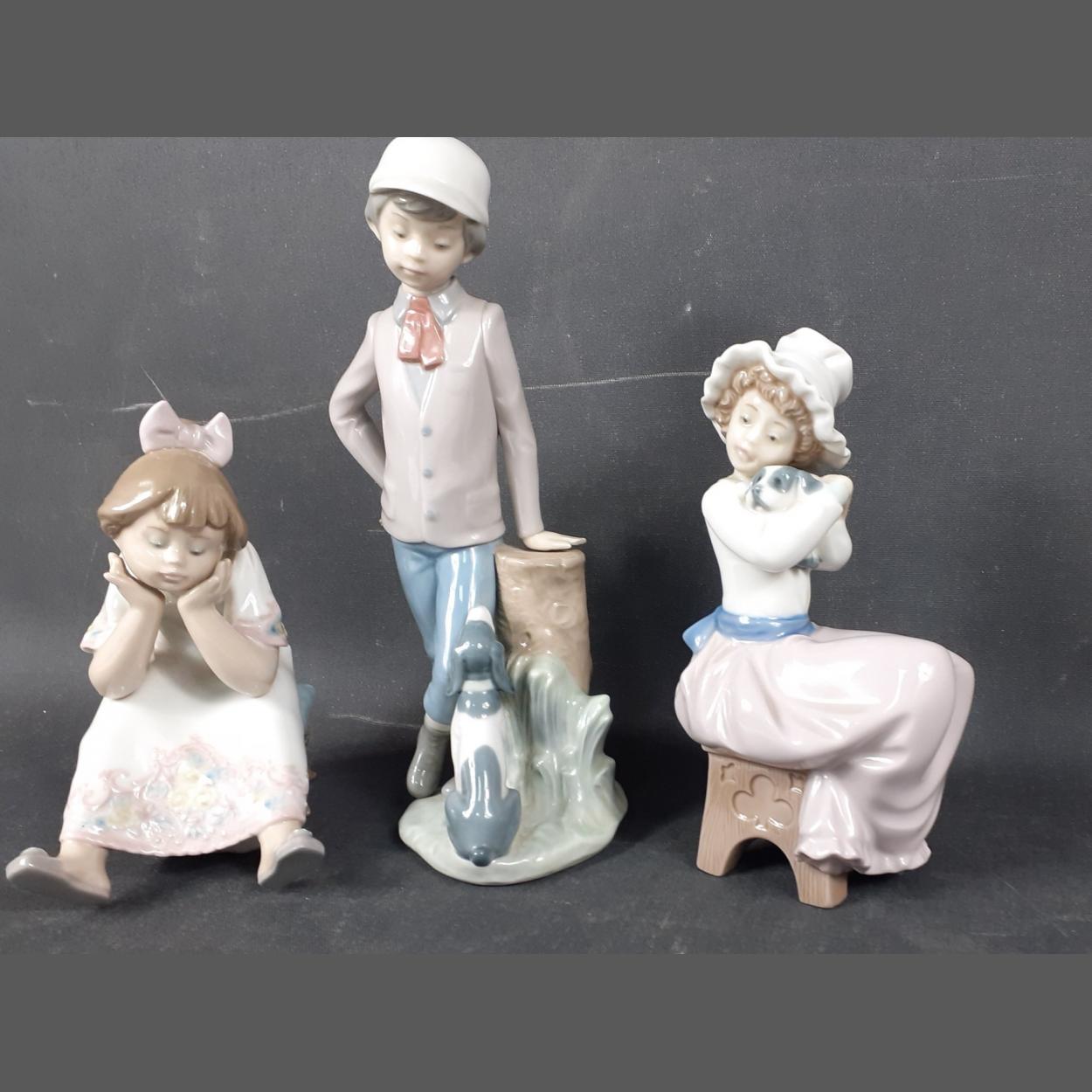 A LLADRO figurine (15cm approx) of a young girl thinking plus two LLADRO NAO figurines of a boy and his dog (23cm high), and a young girl hugging a puppy (17cm high)