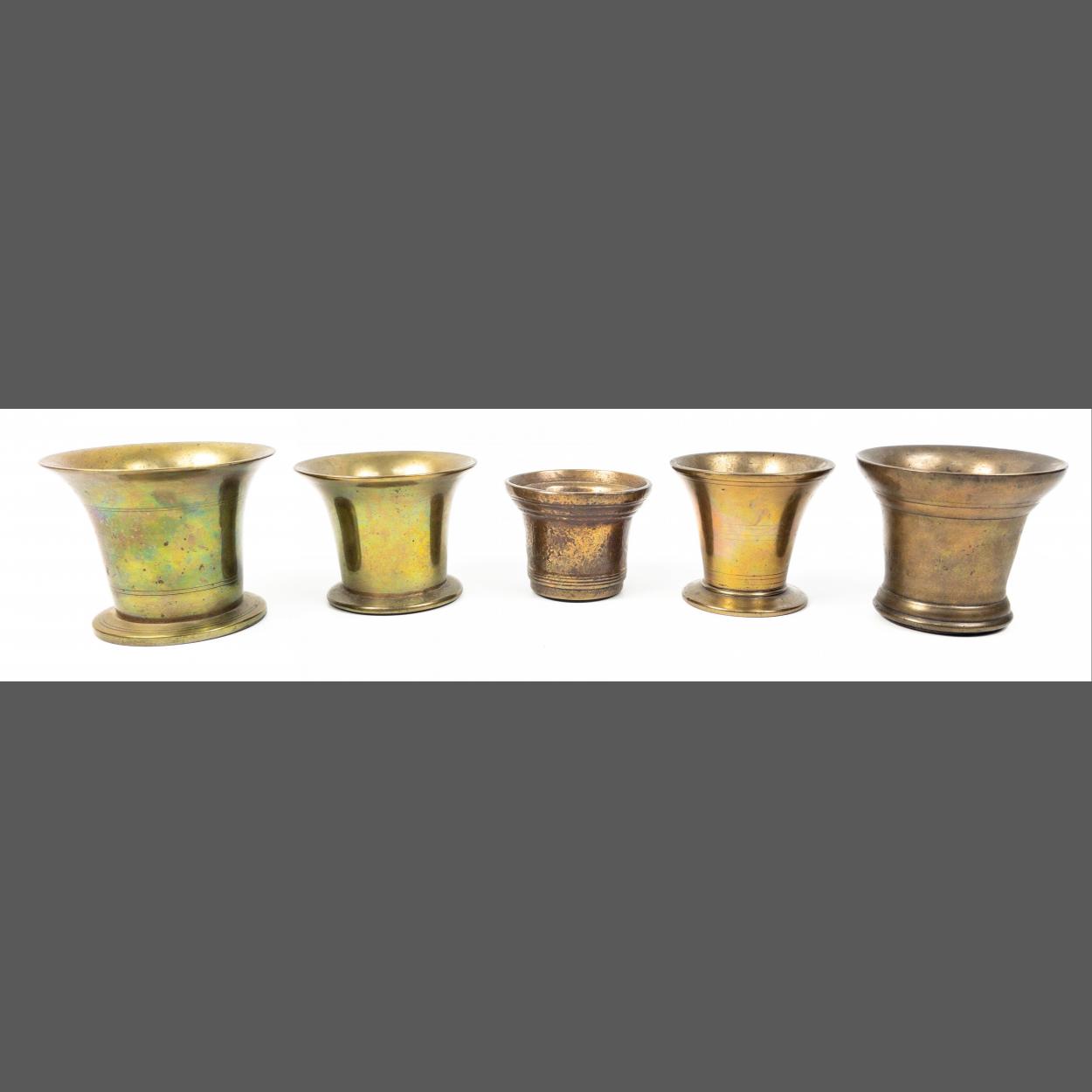 A collection of five brass mortars. Interesting lot ! The largest is 11cm high approx. In overall good collectible uncleaned condition.