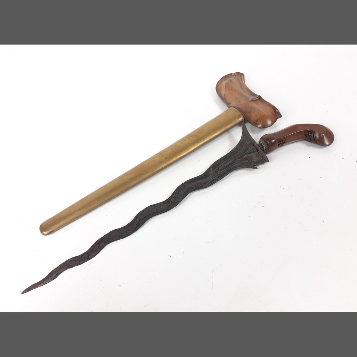 Indonesian KRIS / Keris in copper sheath with Hardwood handle. Interesting blade. Total length 49cm approx. Proof of age will be required from successful bidders.