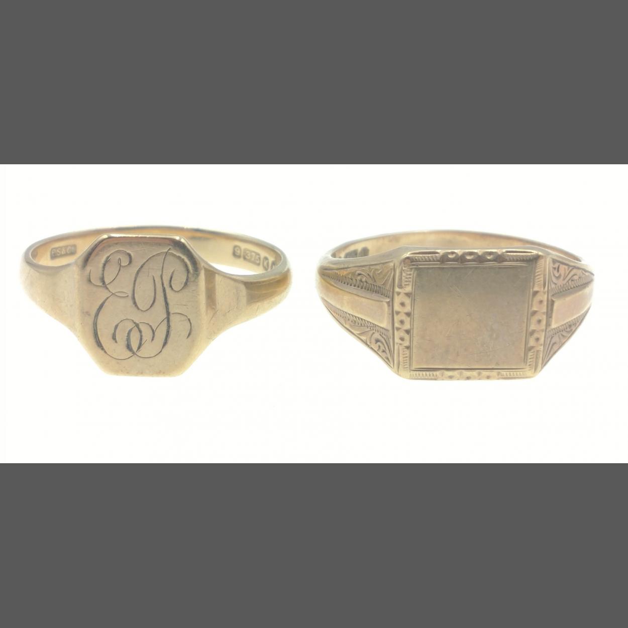 Two signet rings 375 stamped 9.24g total weight approx ring sizes V(with engraving) and W(not engraved)