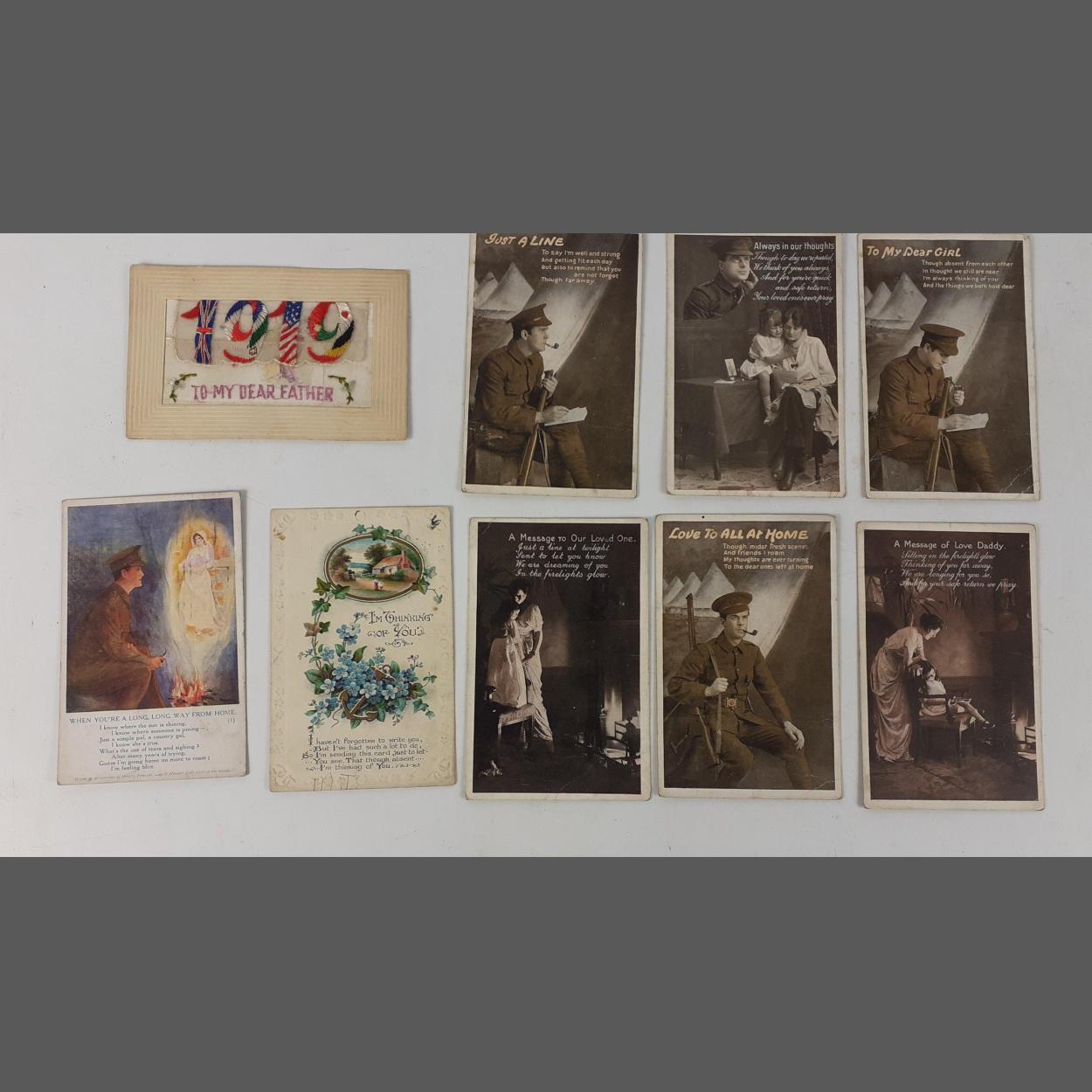 A sweet little collection of WWI postcards from serving father to young daughter at Leeds address. Cute Happy Birthday card from Muriel to her Daddy. Father seems to be in training in Yorkshire area. Nice sentimental little lot. Eight written cards and one silk.