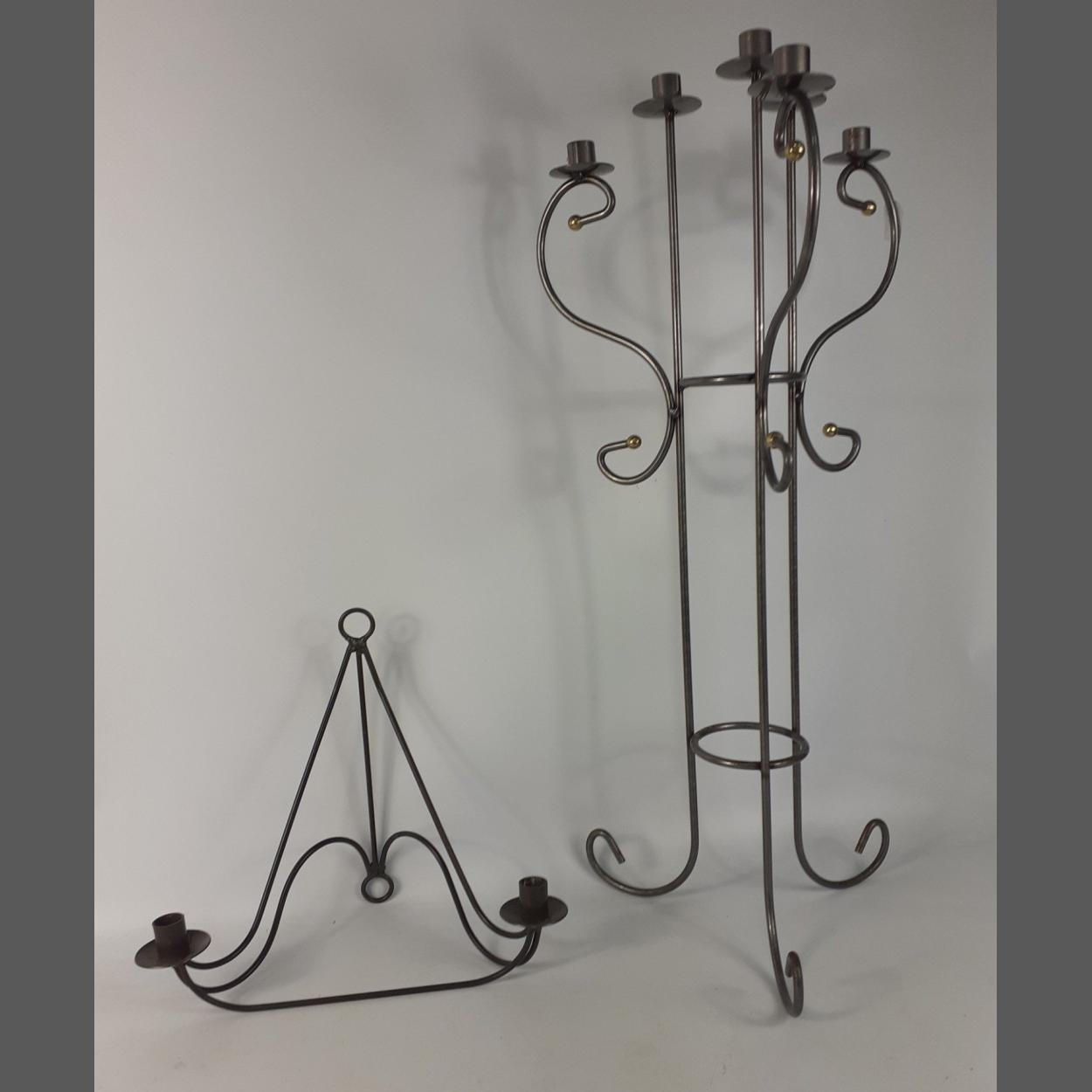 A free standing steel candle stand with six holders and a wall mounted stand with two holders. Both in good used order. Floor stand is 79cm high approx.