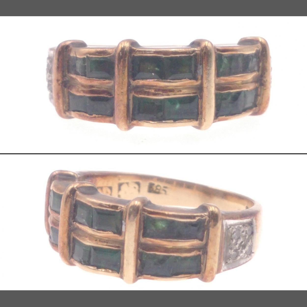 585 stamped yellow gold ring with six green emeralds ring size N gross weight 6.0g approx