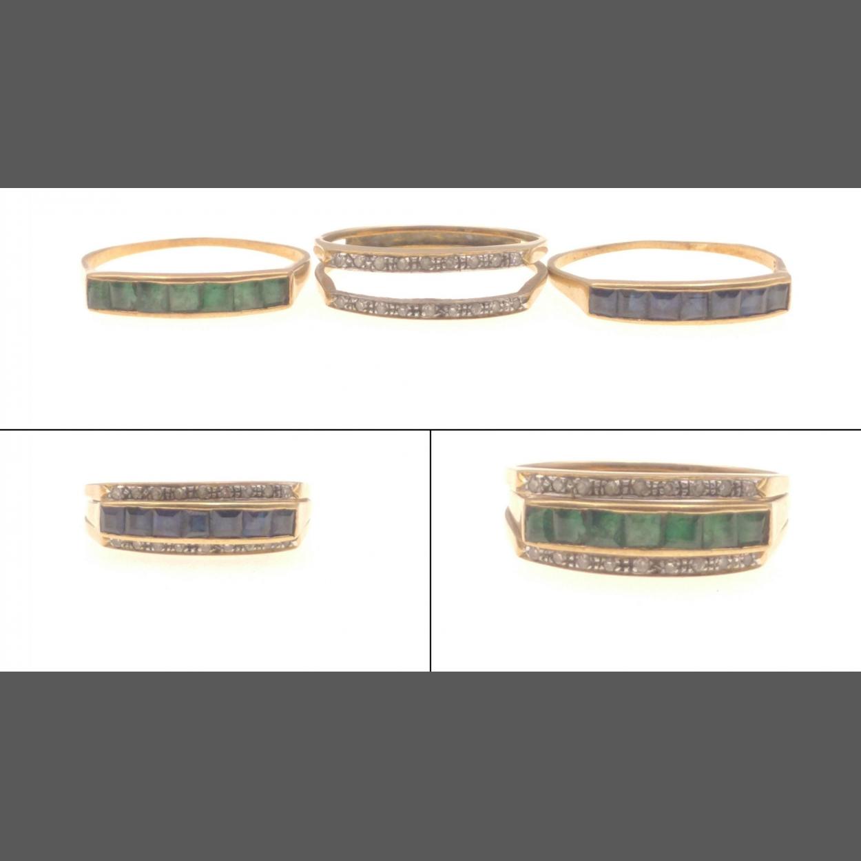 585 stamped yellow gold three interchangeable rings, holder ring with white stone and 2 interchangable rings. One set with blue stones, other with green stones. Gross weight 5.25g approx and ring size P