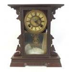 A German wood mantle clock in somewhat distressed condition but clearly a nice piece. 41cm tall approx